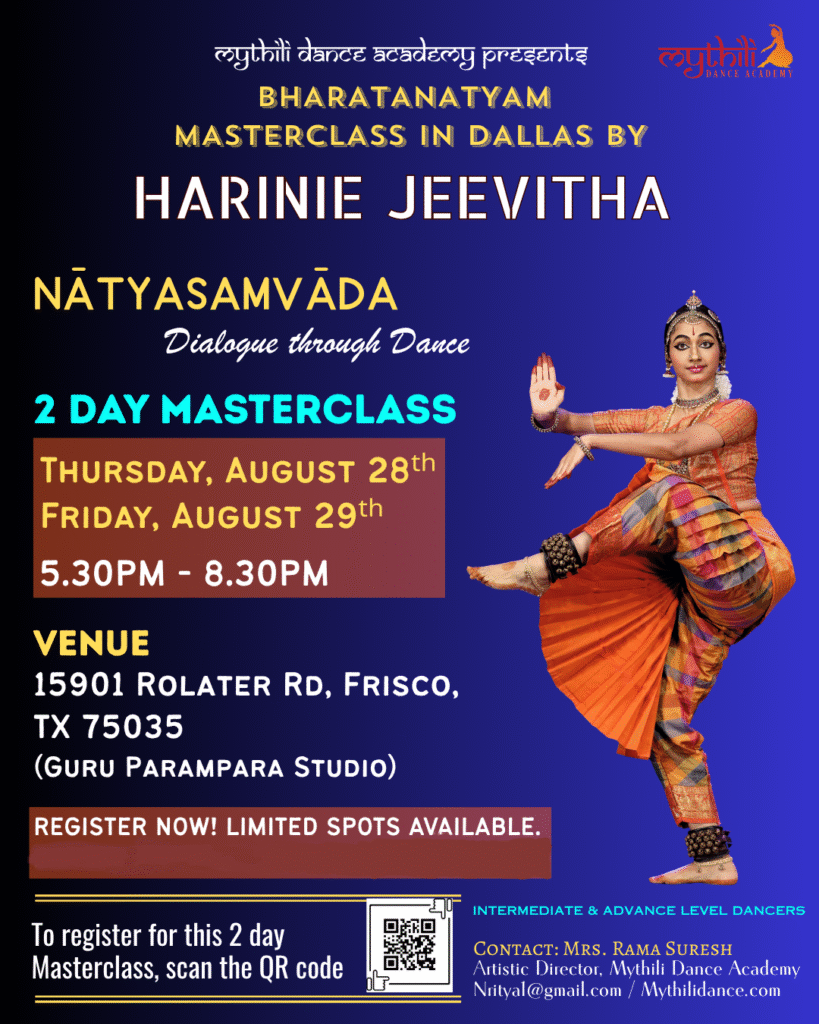 Please fill the form with the link given above. Confirmation of your spot in the Masterclass will be sent via email based on availability. Once your spot is confirmed, zelle details will be sent to pay to secure your confirmed spot. Please note that submitting this form alone does NOT confirm enrollment in the Masterclass. For questions or more info call/text Artistic Director Rama Suresh at (309)868-0229 or email mythilidanceacademy@gmail.com